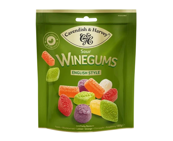 English style Sour Winegums in a resealable pouch for longer-lasting freshness. Only natural colours and flavours. 180g.