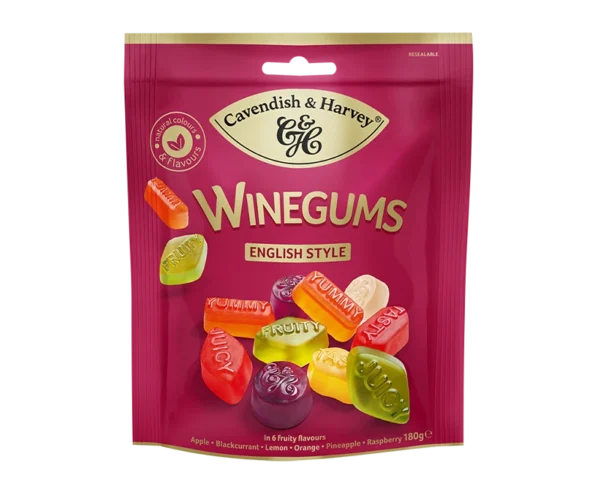 English style Winegums in a resealable pouch for longer-lasting freshness. Only natural colours and flavours.
